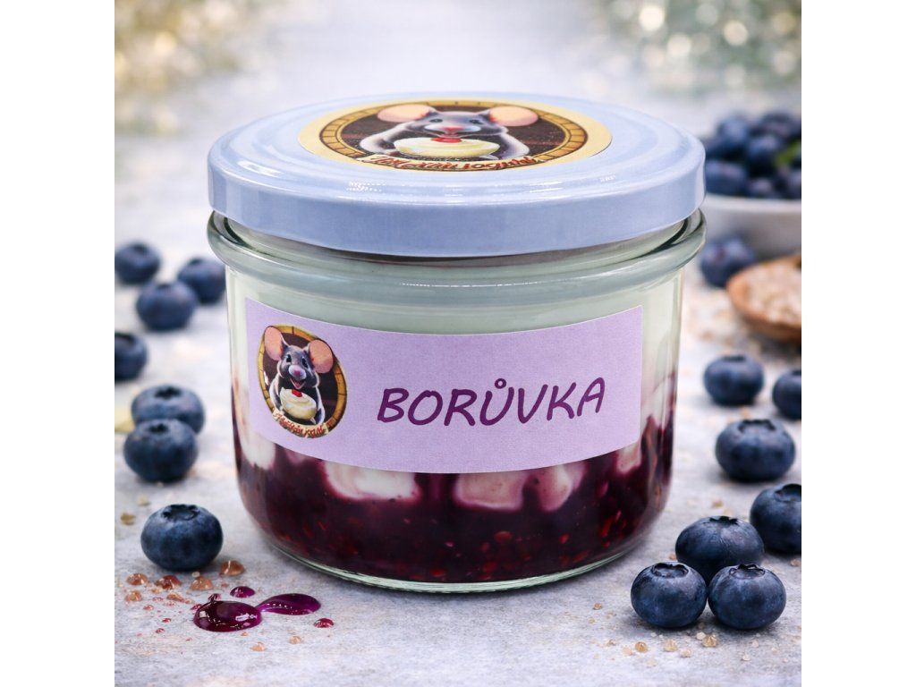 ochucující složka min. 20% : borůvky - kusové ovoce (40%), cukr, ovocný protlak (jablko), voda, modifikovaný škrob, kyselina citrónová, guma gellan, aroma, sorban draselný.